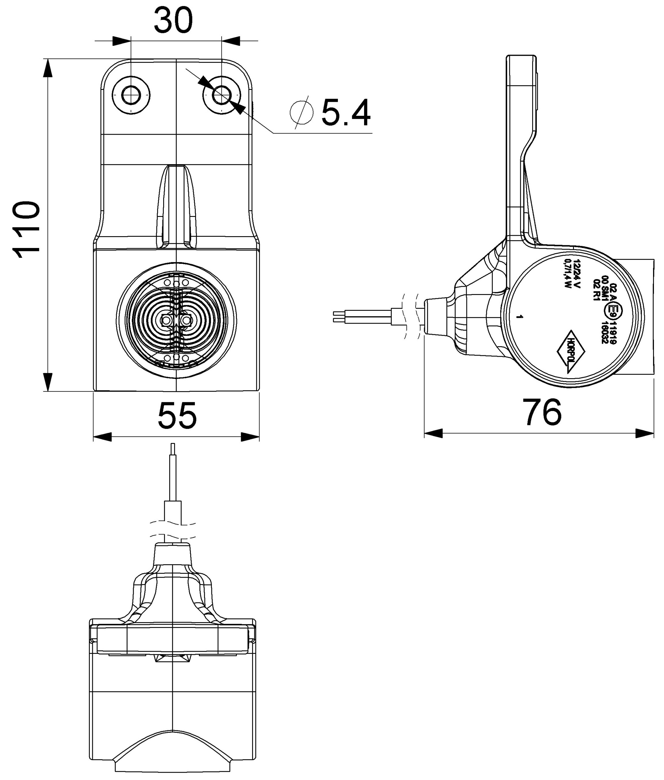LD 3110/P – тройной габаритный фонарь на гибком подвесе, компактных размеров и широкого спектра применения, предназначенный для установки с правой стороны транспортного средства. Фонарь предназначен для использования в небольших прицепах, полуприцепах и грузовиках.