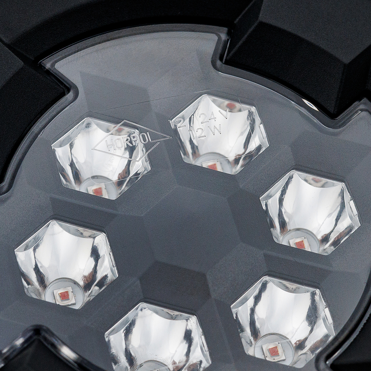 Благодаря светодиодной технологии мощностью 12 Вт устройство создаёт интенсивный световой поток 650 люмен при длине волны 630 нм, обеспечивая отличную видимость красной точки на поверхности. Встроенные 6 светодиодов LED стабильно работают как при напряжении 12 В, так и 24 В, что делает фонарь универсальным и подходящим для большинства типов складской техники.