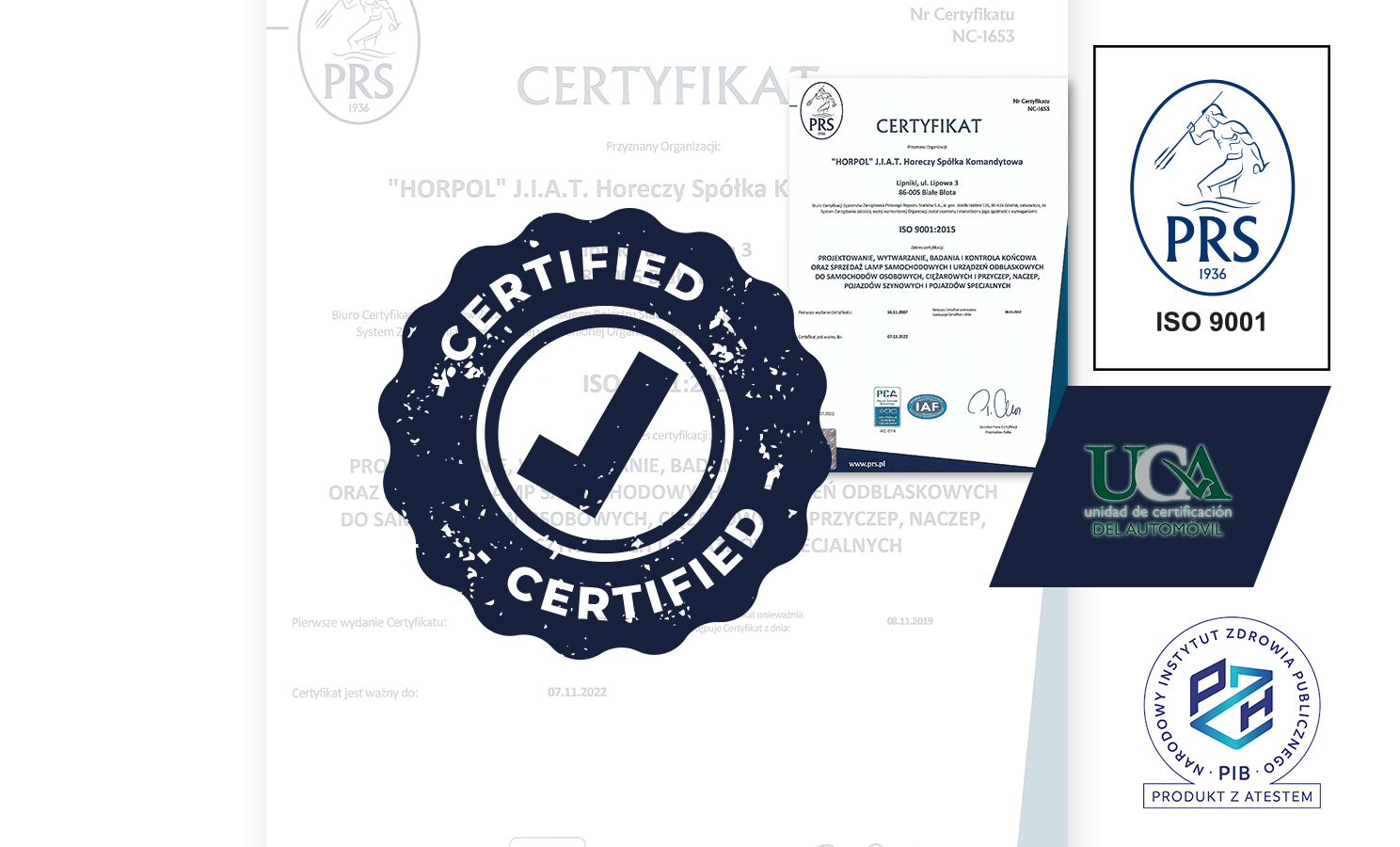 HORPOL A. Horeczy Sp. k. – это компания, специализирующаяся на производстве, проверке и продаже автомобильных фонарей и светоотражающих устройств для всех видов автотранспортных средств. В повседневной работе мы используем современную систему управления качеством в соответствии со стандартом ISO 9001:2015, и при этом прилагаем все усилия для ее постоянного совершенствования. Благодаря этому мы поставляем на рынок изделия высокого класса, отвечающие ожиданиям потребителей и положениям законодательства.